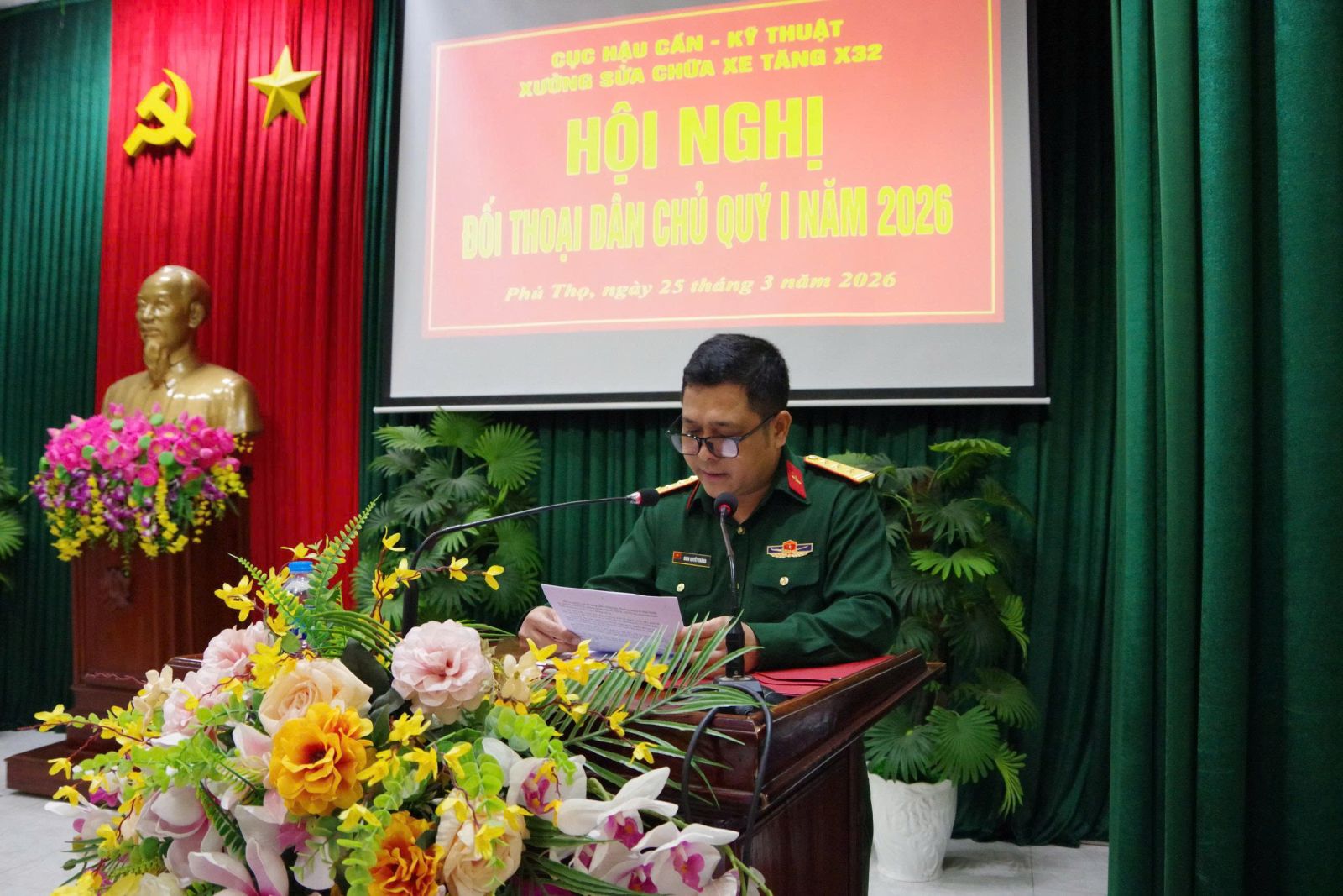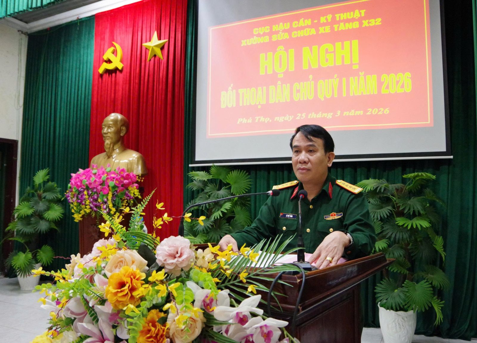 Thực hiện Kế hoạch số 1400/KH-HCKT, ngày 16/3/2026 của Cục Hậu cần –Kỹ thuật về “Tổ chức sinh hoạt đối thoại dân chủ cơ sở Quý I năm 2026”, sáng ngày 25/3/2026, Cục Hậu cần – Kỹ thuật, Binh chủng Tăng thiết giáp tổ chức đối thoại dân chủ quý I năm 2026 với cán bộ, chiến sĩ Xưởng Sửa chữa xe tăng X32.