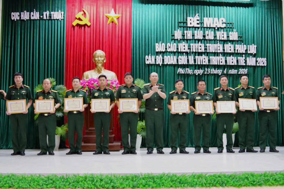 Chiều ngày 23/4/2026, tại Xưởng sửa chữa xe tăng X32 (Xã Tam Dương, tỉnh Phú Thọ), Cục Hậu cần - Kỹ thuật tổ chức Bế mạc Hội thi Báo cáo viên giỏi, Báo cáo viên, tuyên truyền viên pháp luật, cán bộ Đoàn giỏi và tuyên truyền viên trẻ năm 2026. Dự và chủ trì Bế mạc Hội thi có Đại tá Cấn Anh Đức, Bí thư Đảng ủy, Phó Chủ nhiệm Hậu cần - Kỹ thuật Binh chủng và lãnh đạo, chỉ huy các phòng, ban, đơn vị, cán bộ dự thi và đại diện cán bộ, nhân viên các đơn vị.