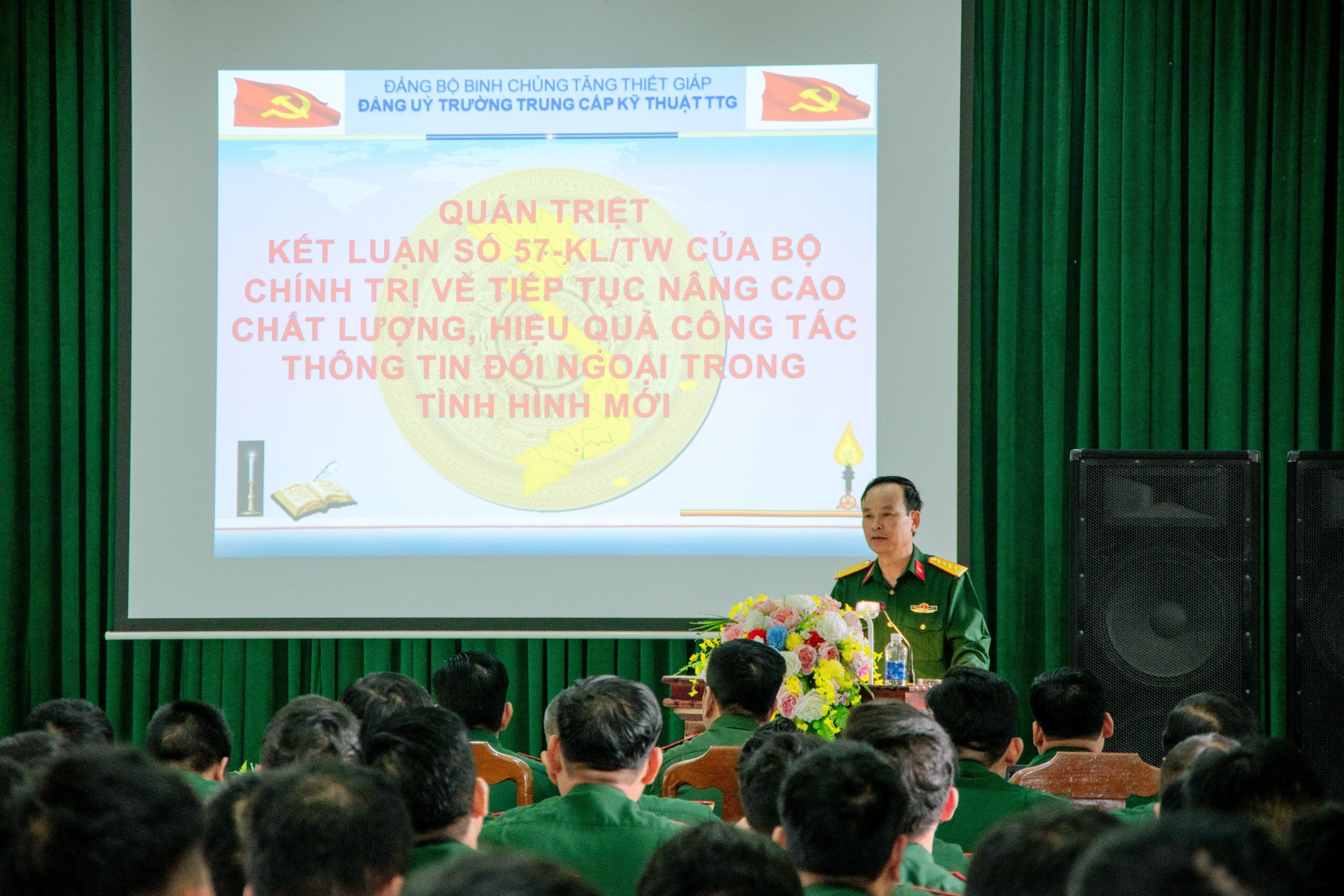 Hội nghị đã được nghe Đại tá Phan Đăng Minh, Bí thư Đảng uỷ Nhà trường giới thiệu những nội dung cơ bản, cốt lõi của Kết luận số 57: Qua 10 năm thực hiện Kết luận số 16-KL/TW, ngày 14/02/2012 của Bộ Chính trị khóa XI về Chiến lược phát triển thông tin đối ngoại giai đoạn 2011-2020, công tác thông tin đối ngoại đã đạt được kết quả quan trọng, góp phần nâng cao vị thế, uy tín của Việt Nam trên trường quốc tế, bảo vệ nền tảng tư tưởng của Đảng, đấu tranh phản bác các quan điểm sai trái, thù địch, luận điệu xuyên tạc, làm thất bại âm mưu chống phá Đảng, Nhà nước, chế độ, sự nghiệp đổi mới, xây dựng và bảo vệ Tổ quốc. Tuy nhiên, công tác thông tin đối ngoại còn một số hạn chế, bất cập đó là chưa phản ánh đầy đủ, sâu sắc thành tựu nổi bật của đất nước; việc triển khai nhiệm vụ còn phân tán, thiếu trọng tâm, trọng điểm; chưa có sự phối hợp chặt chẽ, thống nhất, đồng bộ giữa các cơ quan, tổ chức trong hệ thống chính trị...