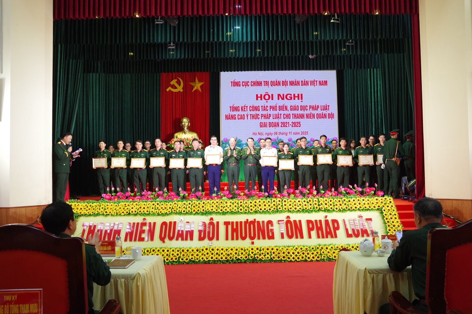 Tại Hội nghị, các đại biểu được thưởng thức chương trình văn nghệ do Đội Nghệ thuật Binh chủng biểu diễn và vở kịch ngắn “Chỉ là giấc mơ” do các nghệ sĩ, diễn viên Nhà hát Kịch nói Quân đội thể hiện. Cũng trong dịp này, Thủ trưởng Tổng cục Chính trị đã trao thưởng cho 55 tập thể, 121 cá nhân có thành tích trong triển khai, tổ chức thực hiện công tác phổ biến, giáo dục pháp luật nhằm nâng cao ý thức pháp luật cho thanh niên Quân đội giai đoạn 2021 - 2025.