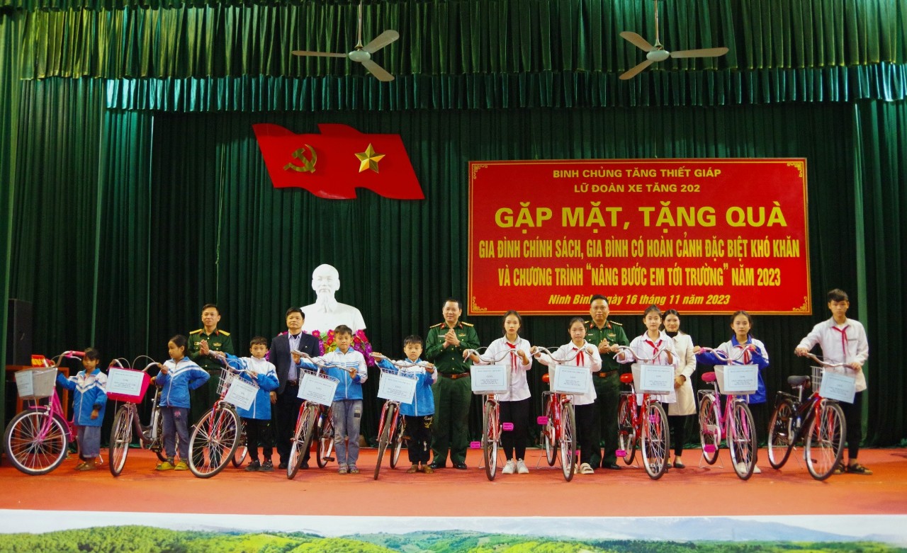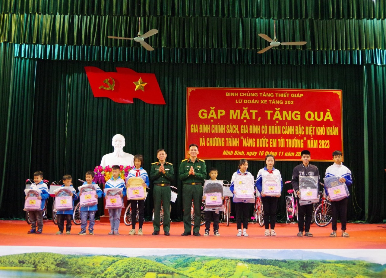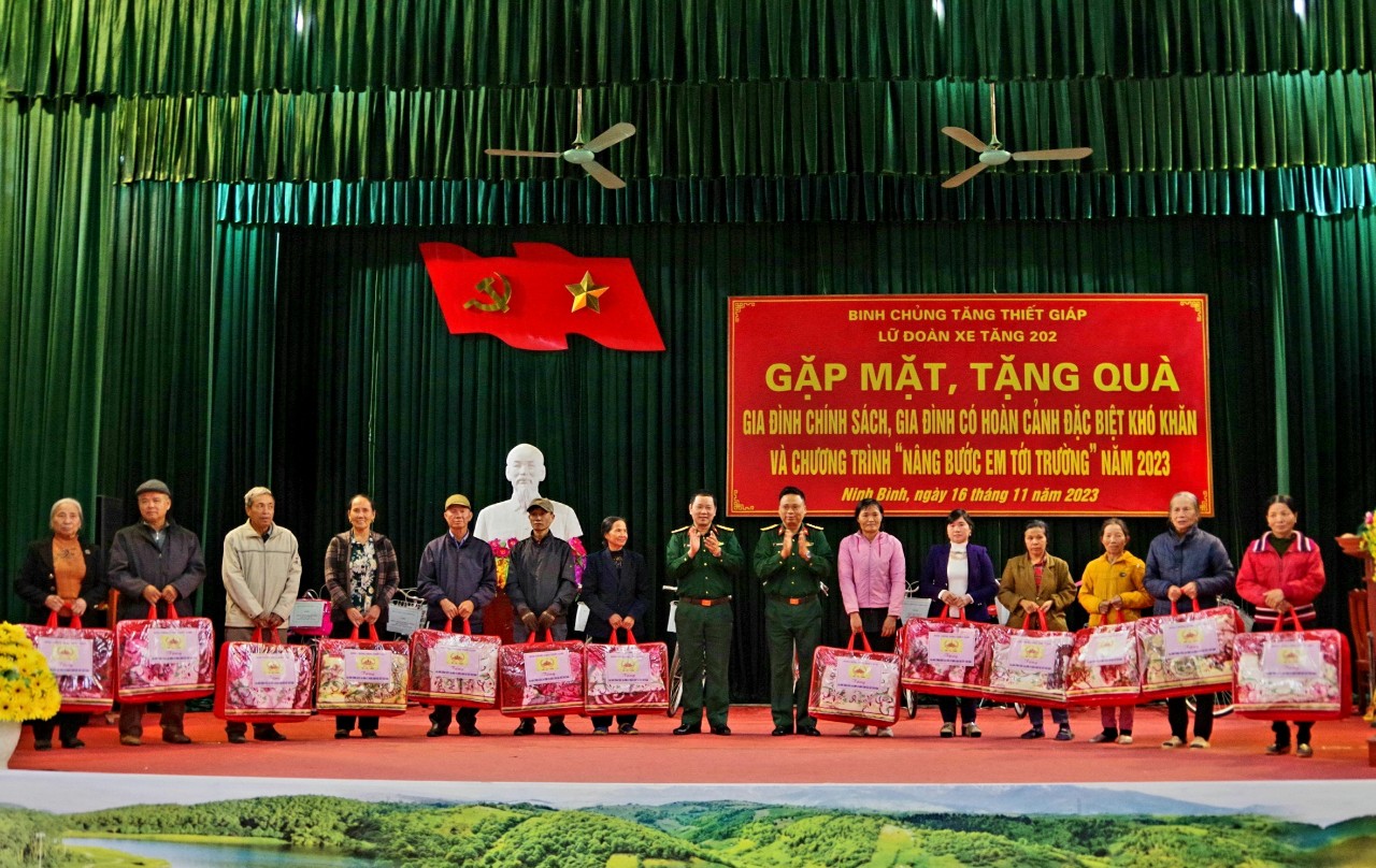 Dịp này, cán bộ, chiến sỹ, Lữ đoàn xe tăng 215 đã trao tặng 40 suất quà, hơn 30 triệu đồng, bằng hiện vật và tiền, mỗi suất trị giá gần 1 triệu đồng cho các gia đình chính sách, gia đình hộ nghèo, có hoàn cảnh khó khăn trên địa bàn các xã Quỳnh Tam, huyện Quỳnh Lưu; xã Nghĩa Lạc, huyện Nghĩa Đàn, tỉnh Nghệ An. Lữ đoàn Tăng thiết giáp 202 đã trao tặng 35 suất quà trong chương trình “Chăn ấm mùa đông” và “Nâng bước em tới trường” bao gồm: 10 cặp sách, 10 chiếc xe đạp, cho các cháu học sinh nghèo vượt khó bậc tiểu học và 15 chiếc chăn len cho người cao tuổi có hoàn cảnh đặc biệt khó khăn với số tiền trị giá gần 40 triệu đồng.