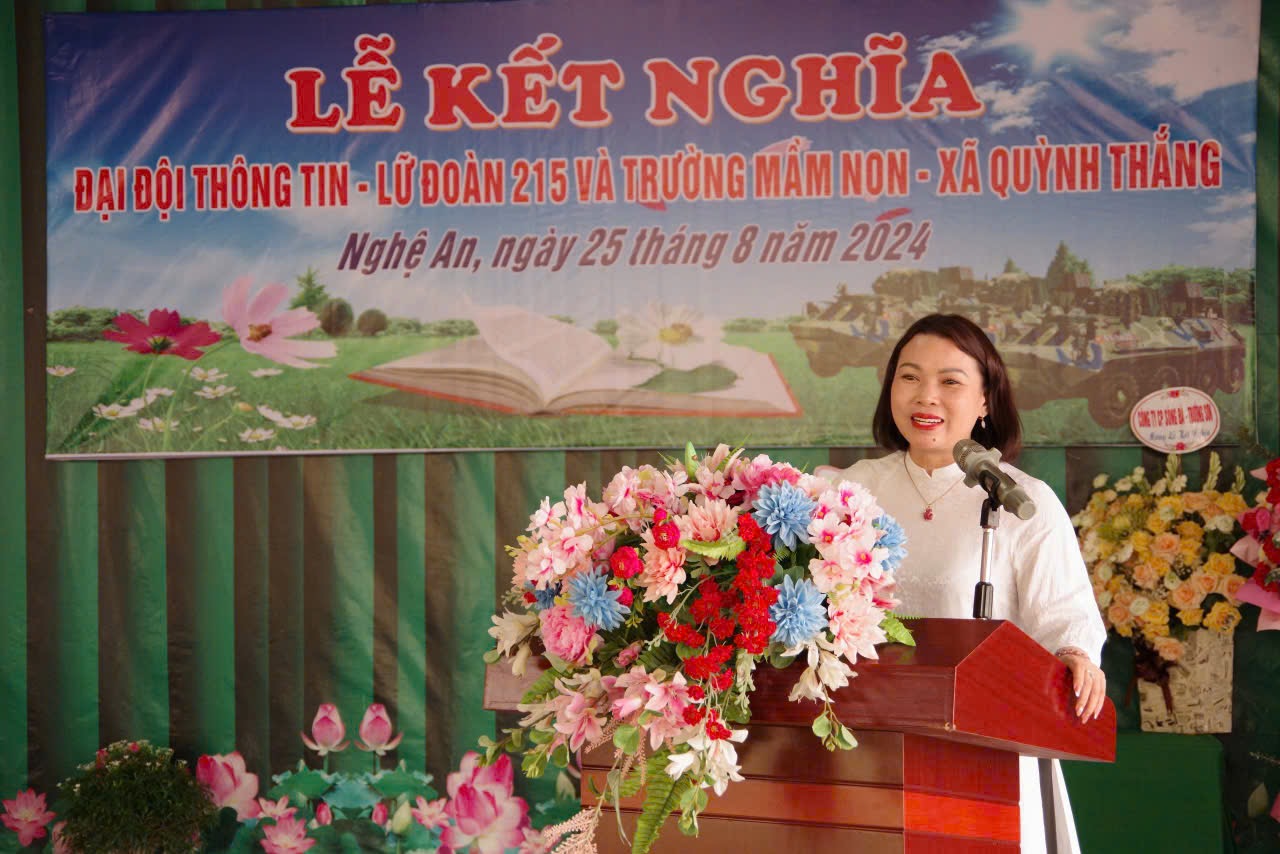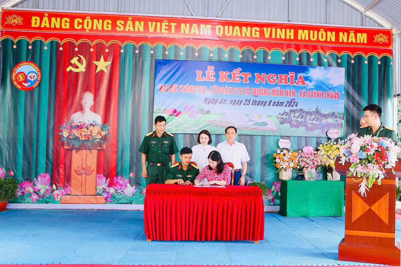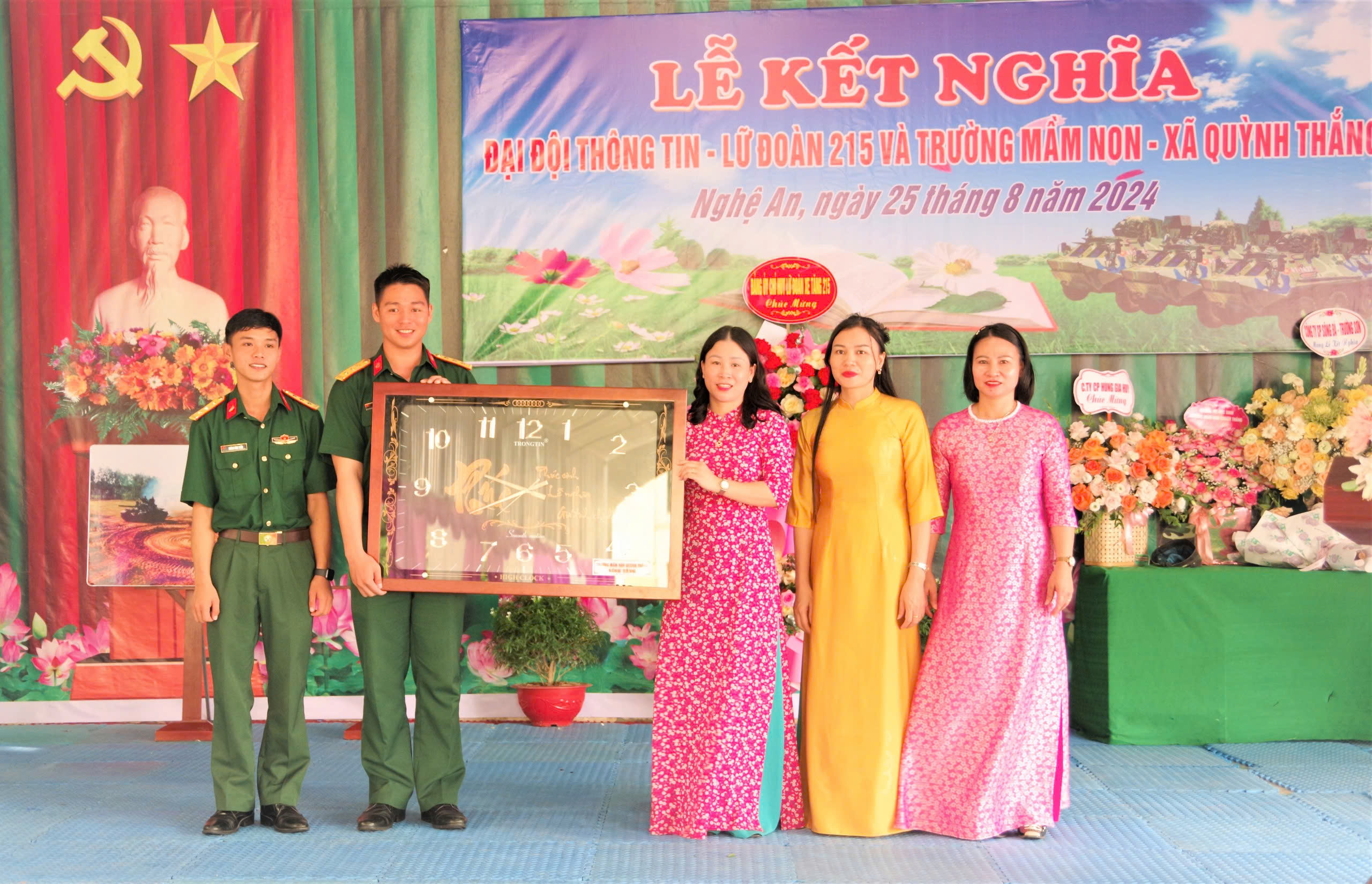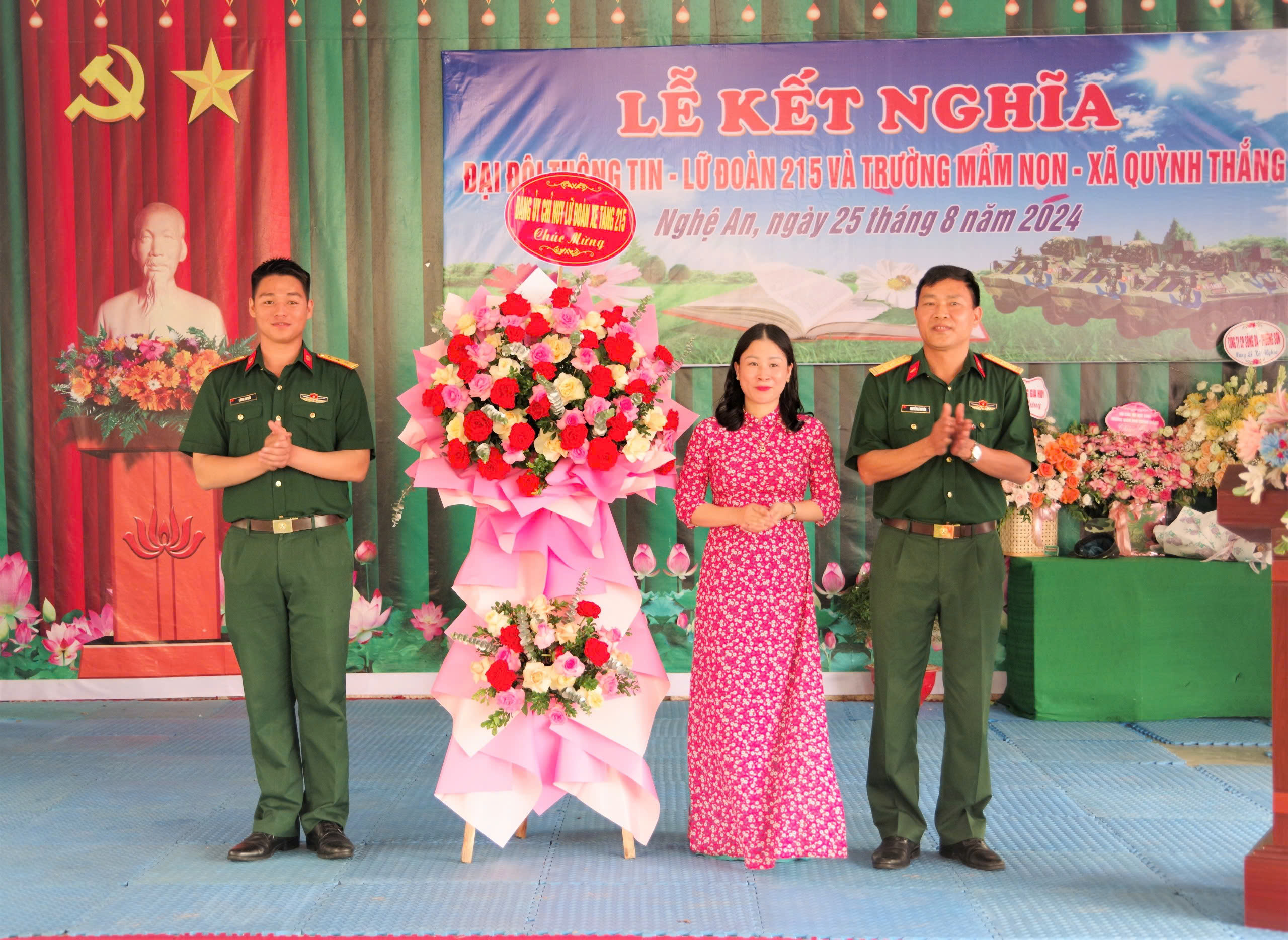 Dự chỉ đạo buổi Lễ kết nghĩa có Thượng tá Nguyễn Bá Huyên, Uỷ viên thường vụ Đảng ủy, Phó Chính ủy, đại biểu cơ quan Tham mưu, Chính trị Lữ đoàn 215; đồng chí Phạm Thị Hải Yến, Uỷ viên thường vụ Huyện ủy, Trưởng ban Dân vận và đại biểu Phòng Giáo dục và đào tạo huyện Quỳnh Lưu; đồng chí Bùi Văn Tiến, Bí thư Đảng ủy, Chủ tịch HĐND xã Quỳnh Thắng. Tham dự buổi lễ có lãnh đạo, đại diện các ban, ngành đoàn thể địa phương, đại biểu các đơn vị doanh nghiệp, nhà trường trên địa bàn và đông đủ cán bộ, chiến sĩ Đại đội Thông tin, tập thể cán bộ, giáo viên Trường Mầm non Quỳnh Thắng.