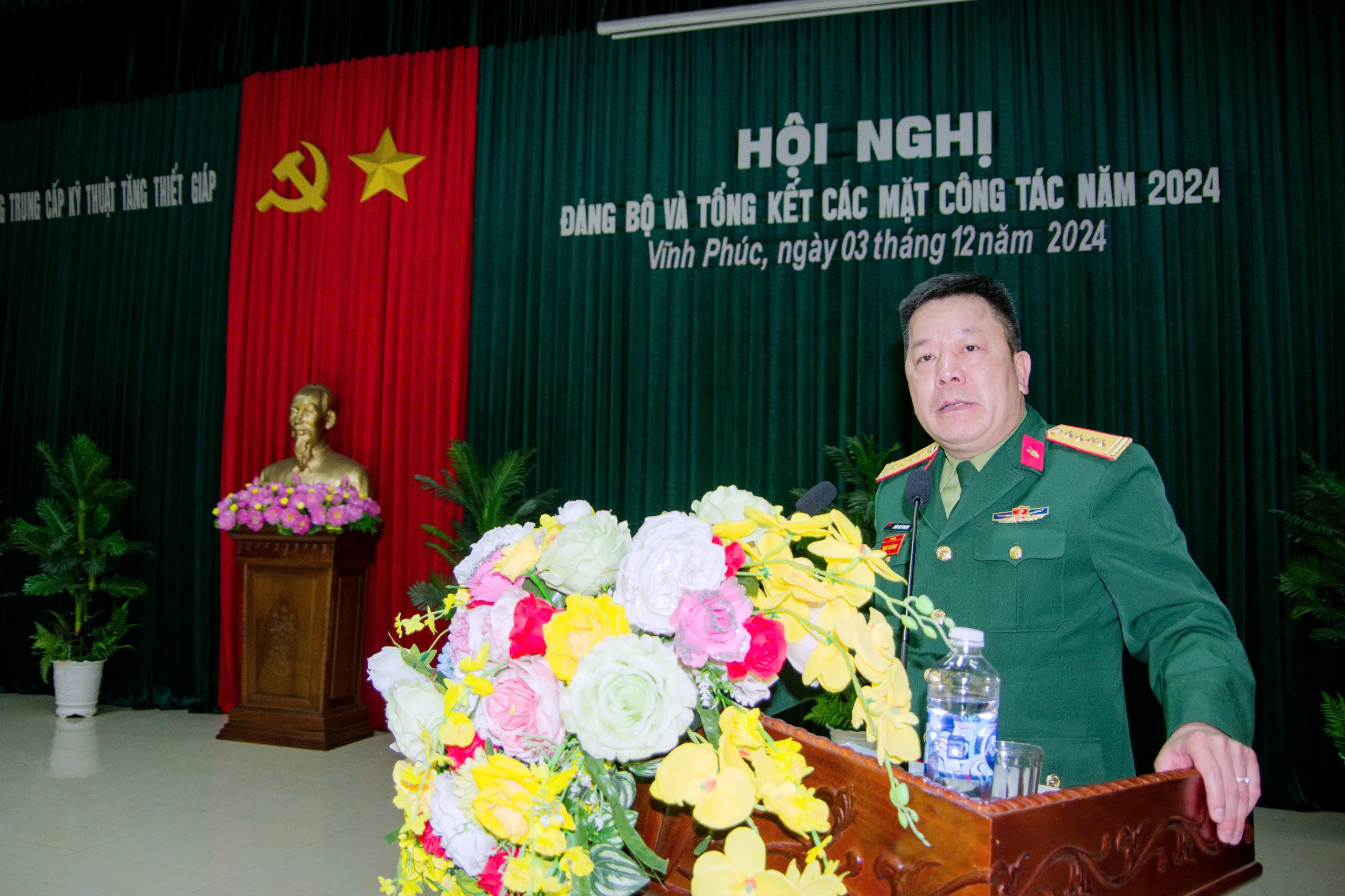 Phát biểu chỉ đạo tại hội nghị, đồng chí Phó chính ủy Binh chủng đã ghi nhận, biểu dương những nỗ lực, cố gắng và kết quả đã đạt được của Nhà trường trong năm 2024; cùng với đó đồng chí yêu cầu thời gian tới cán bộ, chiến sĩ Nhà trường tiếp tục quán triệt, triển khai tổ chức thực hiện có hiệu quả các nghị quyết, chỉ thị về thực hiện nhiệm vụ chính trị và tổ chức Đại hội Đảng các cấp; tăng cường công tác quản lý bộ đội, đẩy mạnh xây dựng chính quy, rèn luyện kỷ luật, giữ vững và tiếp tục xây dựng đảng bộ Nhà trường hoàn thành xuất sắc nhiệm vụ “Tiêu biểu”, Nhà trường vững mạnh toàn diện “Mẫu mực, tiêu biểu”.