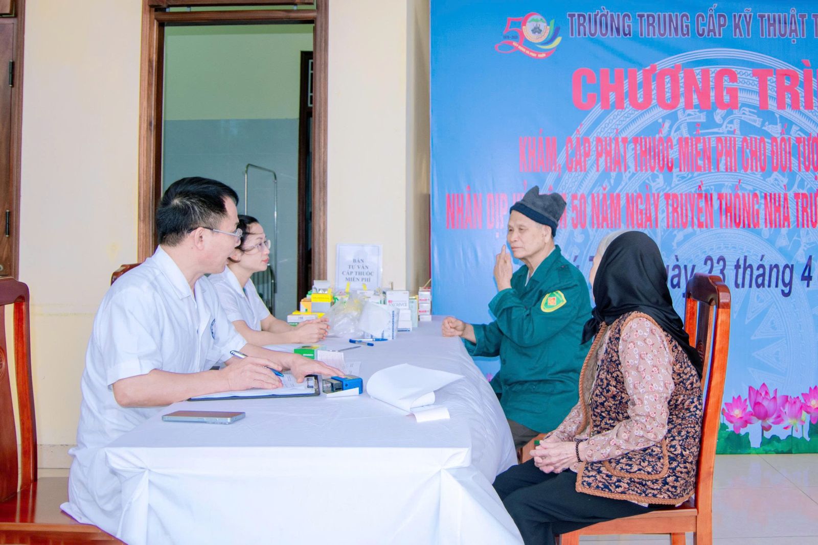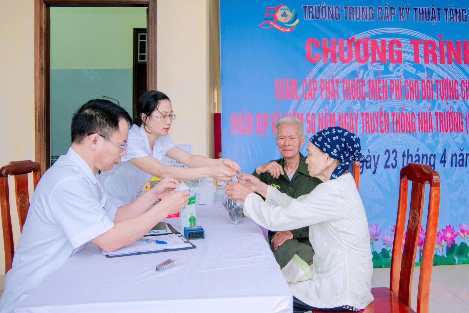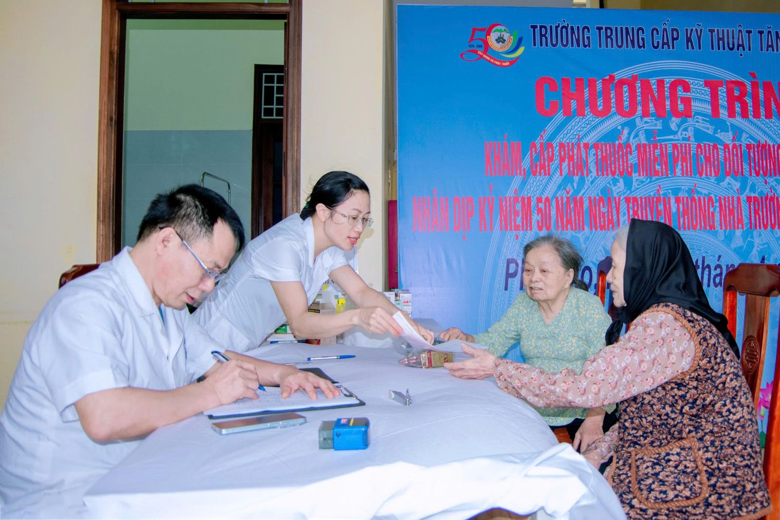Bệnh xá Nhà trường cấp thuốc miến phí cho nhân dân.