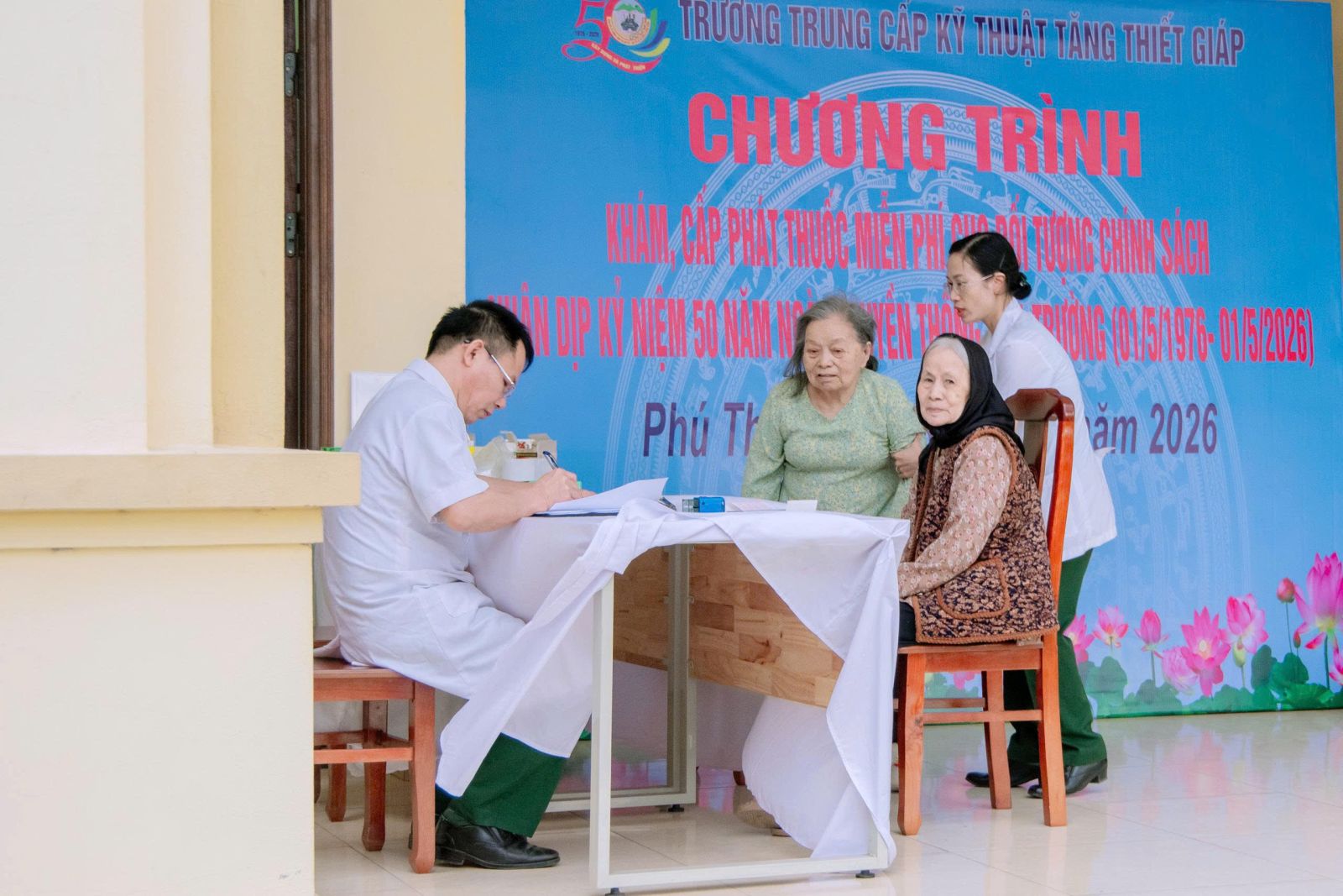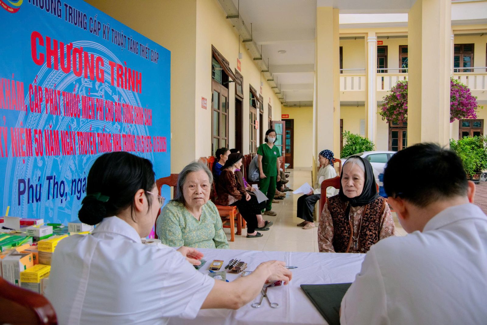 Tại buổi khám bệnh các y, bác sĩ của Nhà trường đã ân cần hỏi thăm sức khỏe, động viên, tư vấn và khám lâm sàng, cận lâm sàng, cấp thuốc miễn phí cho bà con nhân dân thuộc các đối tượng là thương binh, bệnh binh, gia đình liệt sỹ, người có công, nạn nhân chất độc da cam, hộ nghèo, hộ cận nghèo xã Bình Xuyên, tỉnh Phú Thọ.