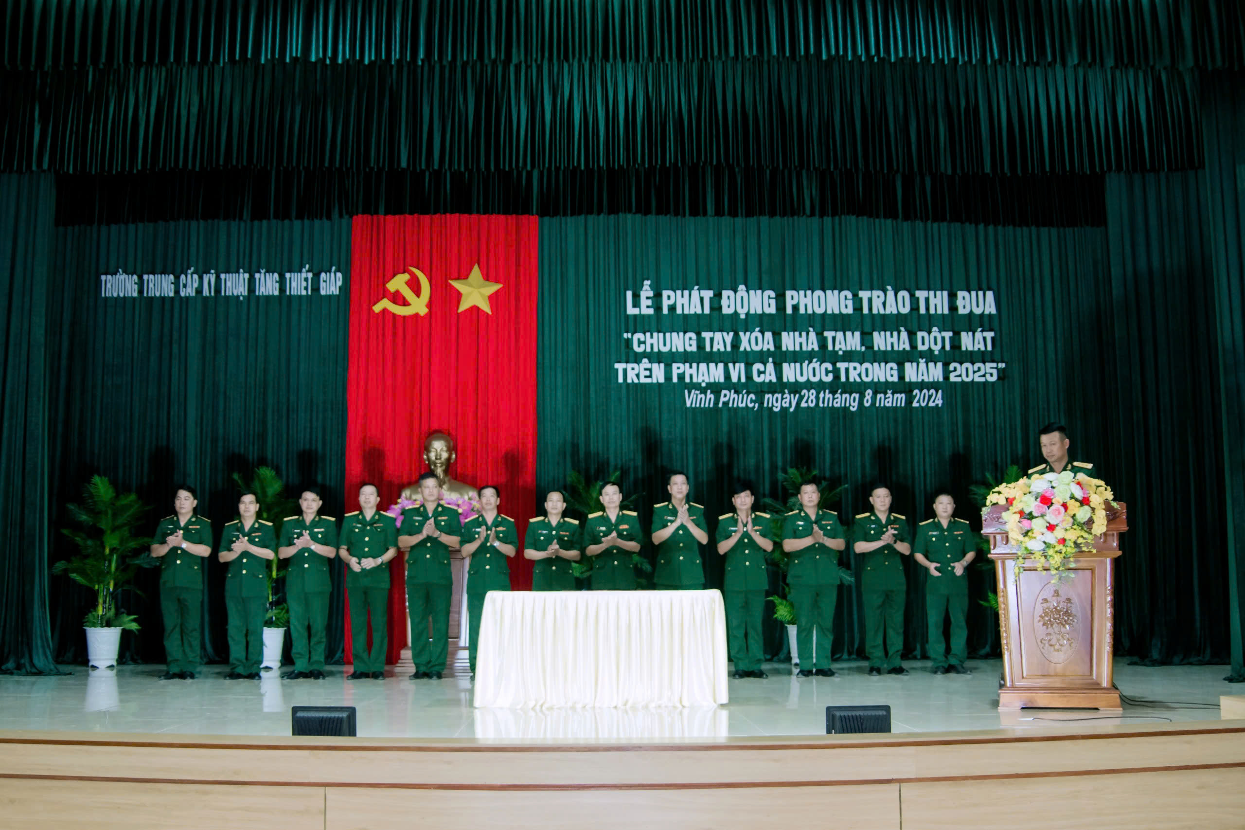 Phát biểu tại buổi lễ, Đại tá Phan Đăng Minh, Chính ủy Nhà trường yêu cầu 100% các cơ quan, khoa giáo viên, đơn vị có hành động trực tiếp đóng góp kinh phí, công sức xây dựng nhà tạm, nhà dột nát cho các hộ nghèo, hộ cận nghèo, người dân bị ảnh hưởng bởi thiên tai, biến đổi khí hậu, gia đình quân nhân khó khăn về nhà ở để hỗ trợ, góp phần cùng cả nước thực hiện thắng lợi mục tiêu: “Xóa nhà tạm, nhà dột nát trên phạm vi cả nước trong năm 2025”./.
