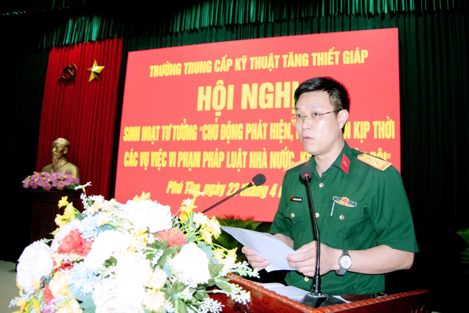 Ngày 22/4, tại Phú Thọ, Trường Trung cấp Kỹ thuật Tăng thiết giáp tổ chức Hội nghị sinh hoạt tư tưởng “Chủ động phát hiện, ngăn chặn kịp thời các vụ việc vi phạm pháp luật nhà nước, kỷ luật quân đội”. Đại tá Phan Đăng Minh, Bí thư Đảng ủy, Chính ủy Nhà trường chủ trì Hội nghị; cùng dự có Đại tá Phạm Huy Tuấn, Phó Bí thư Đảng ủy, Hiệu trưởng Nhà trường; thủ trưởng Ban Giám hiệu Nhà trường, thủ trưởng các cơ quan, khoa giáo viên, đơn vị và cán bộ, chiến sĩ toàn trường.
