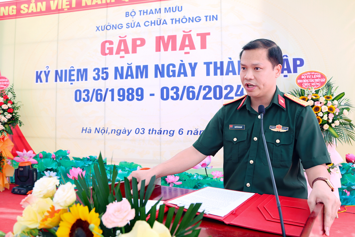 Phát biểu tại buổi gặp mặt, đồng chí Phó Tư lệnh - TMT Binh chủng ghi nhận, biểu dương những thành tích đã đạt được của Xưởng Sửa chữa Thông tin trong chặng đường 35 năm qua và chỉ ra một số nhiệm vụ trọng tâm trong thời gian tới, yêu cầu cán bộ, chiến sĩ toàn Xưởng phát huy hơn nữa những thành tích, kết quả đã đạt được, phấn đấu hoàn thành xuất sắc mọi nhiệm vụ được giao, đáp ứng yêu cầu, nhiệm vụ trong tình hình mới.