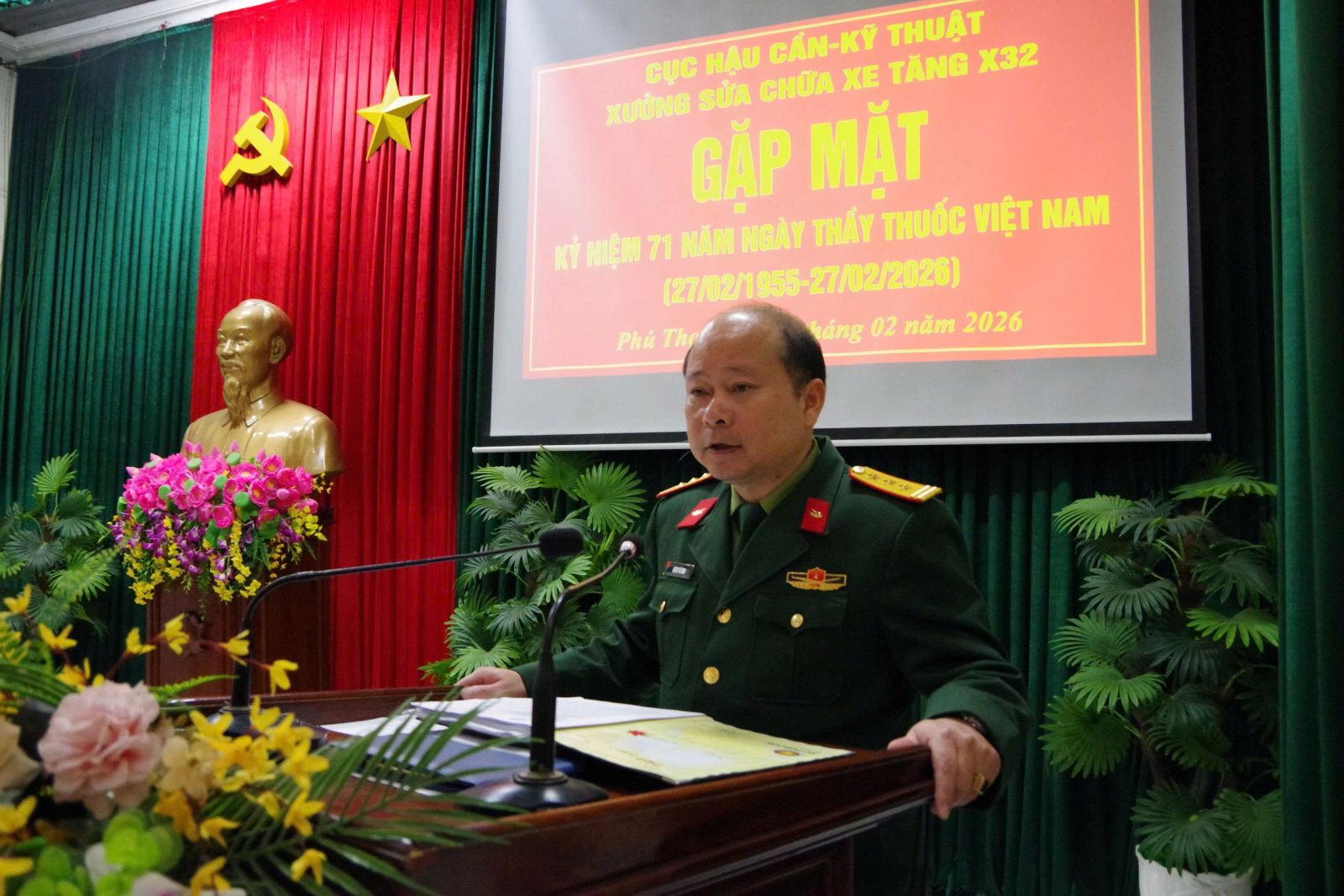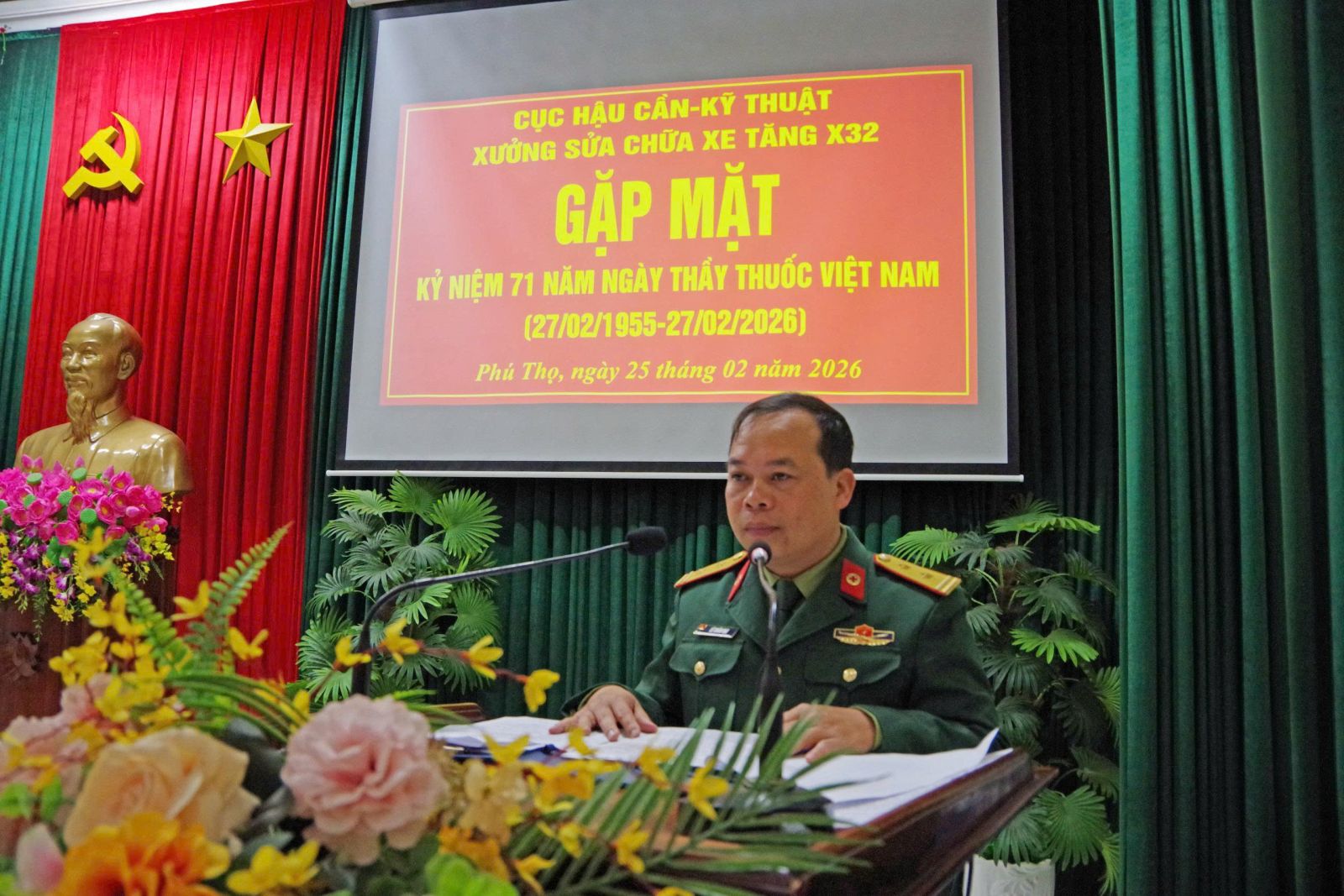 Nhân kỷ niệm 71 năm Ngày Thầy thuốc Việt Nam (27/2/1955 – 27/2/2026), sáng 25/2/2026, Xưởng Sửa chữa xe tăng X32 tổ chức gặp mặt, chúc mừng đội ngũ cán bộ, nhân viên ngành Quân y đang công tác tại đơn vị.