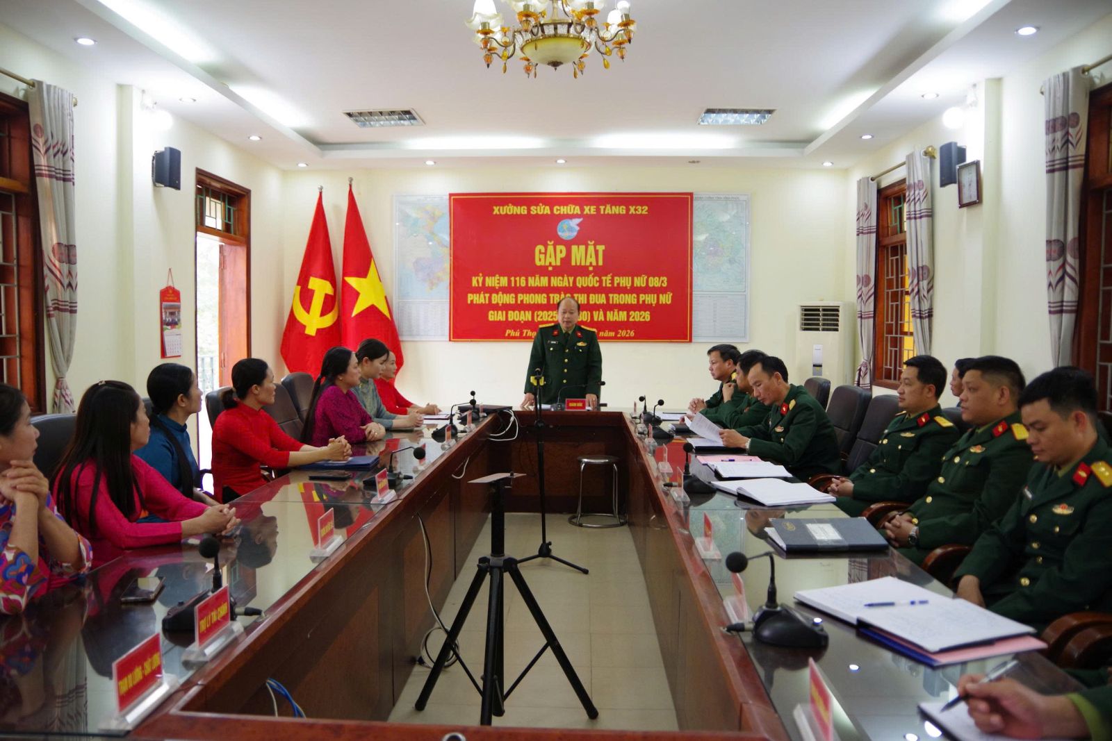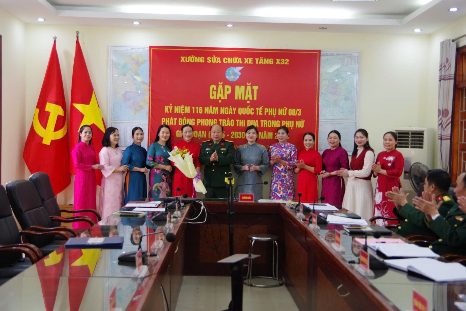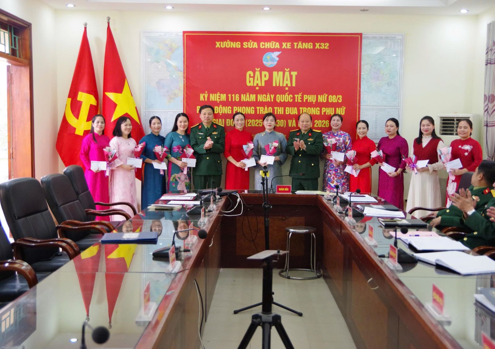 Nhân dịp kỷ niệm 116 năm Ngày Quốc tế Phụ nữ 8/3 và 33 năm Ngày truyền thống Phụ nữ Quân đội; Chiều ngày 05/3/2026, Đảng ủy, Ban Giám đốc Xưởng Sửa chữa xe tăng X32 đã tổ chức gặp mặt thân mật cán bộ, hội viên phụ nữ trong toàn đơn vị; Nhằm động viên, chúc mừng và ghi nhận những đóng góp của chị em đối với việc tổ chức thực hiện, hoàn thành nhiệm vụ chung của đơn vị.