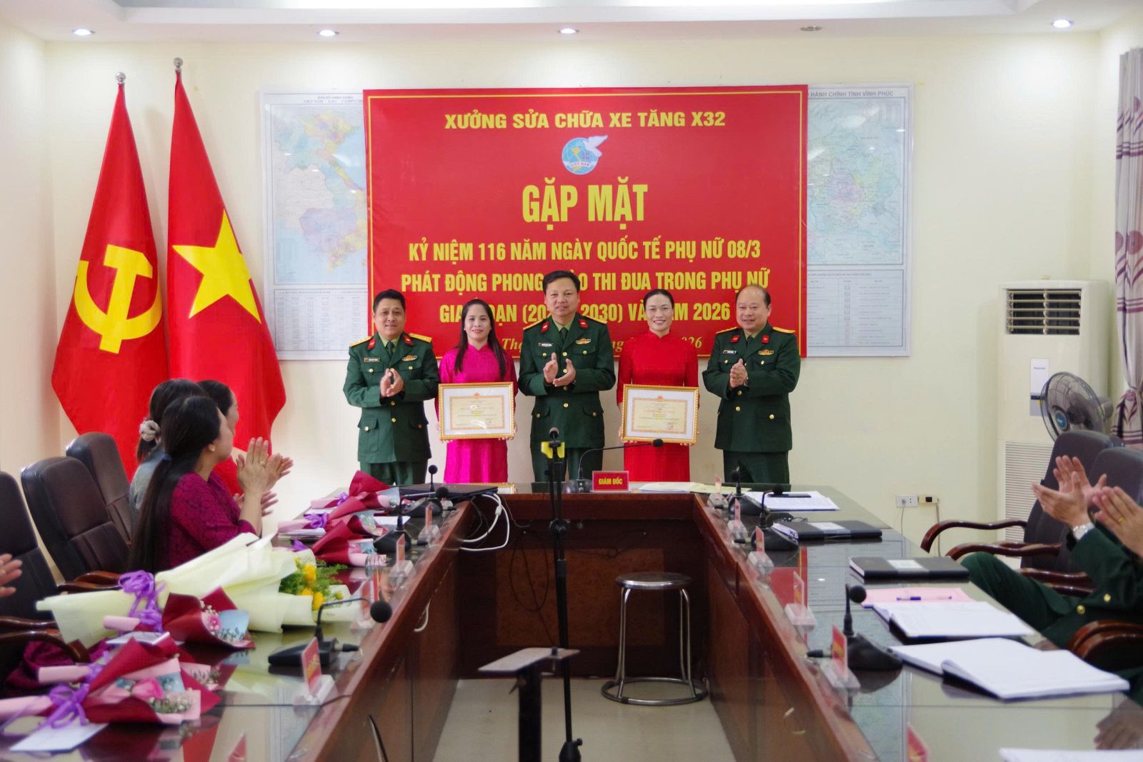 Nhân dịp này, Ban Giám đốc Xưởng đã trao tặng Giấy khen cho 02 Hội viên có thành tích xuất sắc trong công tác Phụ nữ và phong trào Phụ nữ năm 2025; tặng hoa và quà chúc mừng cán bộ, hội viên phụ nữ trong toàn đơn vị. Đồng thời, Hội Phụ nữ Xưởng sửa chữa xe tăng X32 đã phát động phong trào thi đua giai đoạn 2025 - 2030 và năm 2026 trong Hội phụ nữ toàn Xưởng.