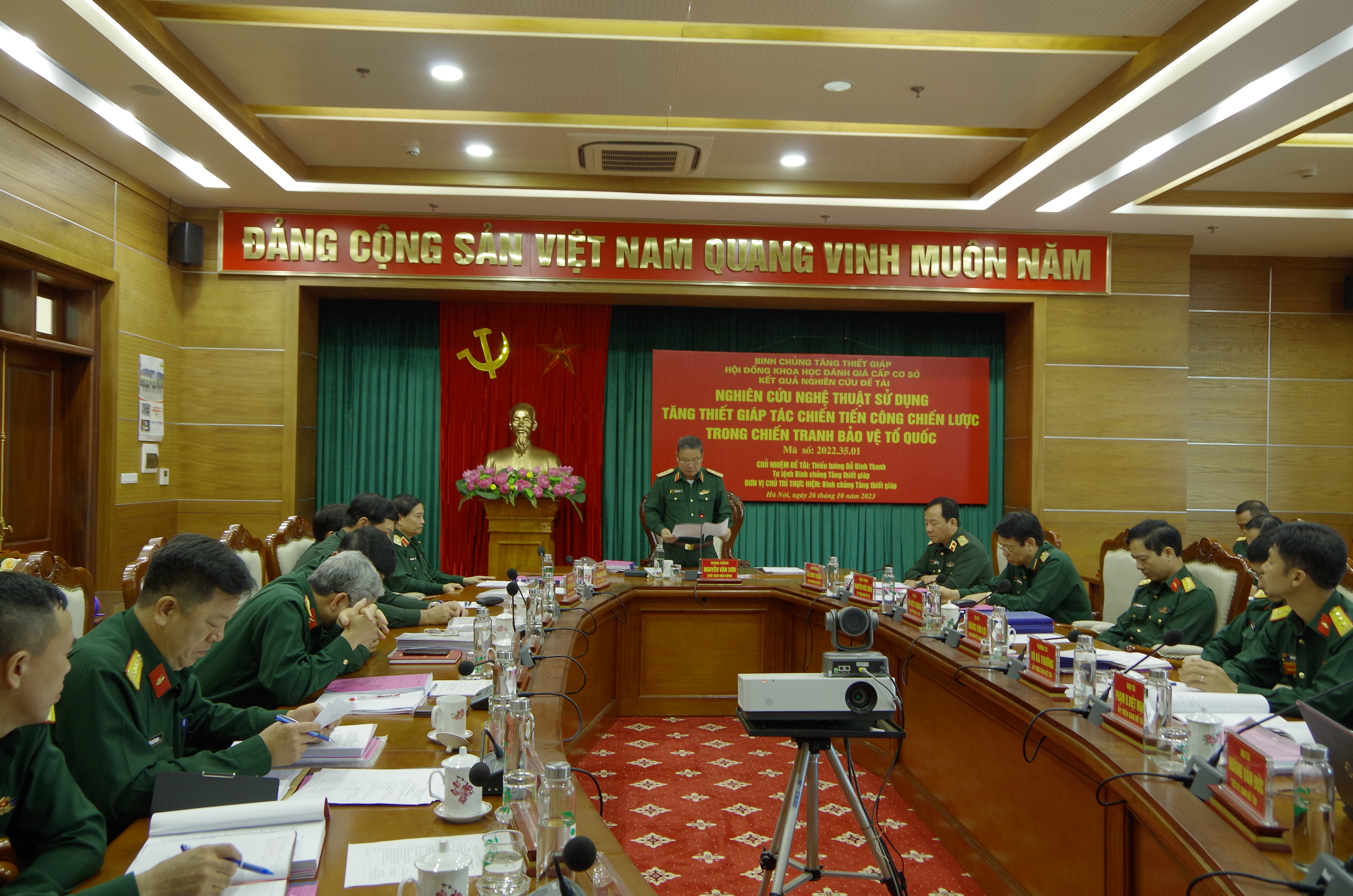 Tại phiên họp, Ban Chủ nhiệm Đề tài báo cáo tóm tắt kết quả nghiên cứu và trả lời chất vấn các ý kiến của Hội đồng. Sau gần 3 giờ làm việc khẩn trương, nghiêm túc, Hội đồng đánh giá cao nội dung Đề tài mang tính khoa học, có đầy đủ luận cứ, luận chứng, luận điểm, mang ý nghĩa chiến lược; hội tụ đầy đủ yếu tố giữa lý luận và thực tiễn; nhất là đã đề ra 05 giải pháp nâng cao hiệu quả sử dụng Tăng thiết giáp tác chiến chiến lược đáp ứng yêu cầu, nhiệm vụ bảo vệ Tổ quốc trong tình hình mới và nhất trí đề nghị Bộ Quốc phòng nghiệm thu theo kế hoạch.