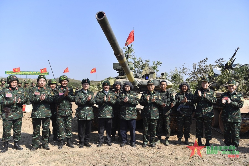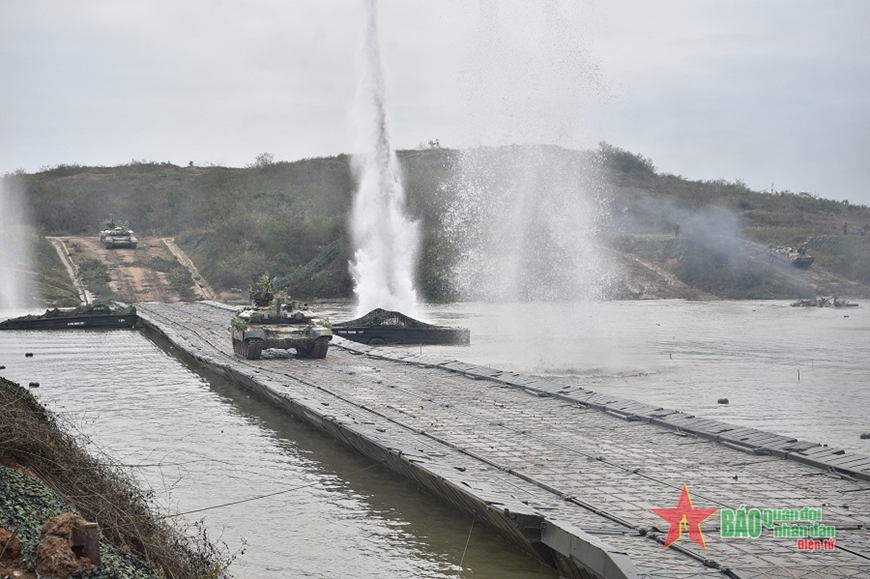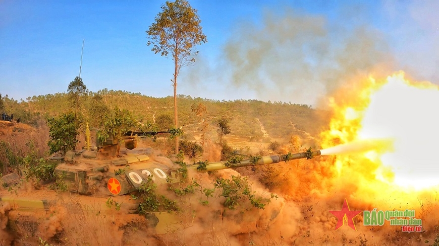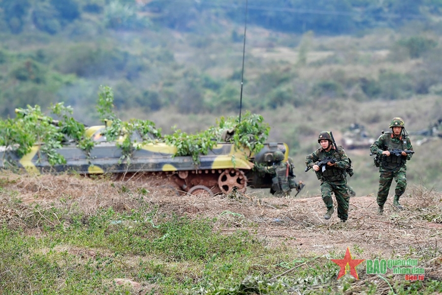 Từ xa, đội hình tên lửa, pháo binh, các loại pháo phòng không dồn dập làm cho quân địch không kịp trở tay. Hỏa lực chuyển làn, lực lượng xe tăng đổ dốc, vượt hào sâu, hùng dũng chiếm lĩnh trận địa chế áp mạnh vào hỏa lực địch; các chiến sĩ được trang bị máy thông tin, mặt nạ phòng hóa, áo giáp tích hợp, mũ chống đạn, sử dụng súng trường STV-380, súng AK... từ trên xe thiết giáp lao xuống xung phong đánh chiếm mục tiêu. Phát huy sức mạnh hiệp đồng chiến đấu quân, binh chủng, đồng loạt xung phong vượt qua cửa mở, nhanh chóng đánh các mục tiêu, làm chủ trận địa.