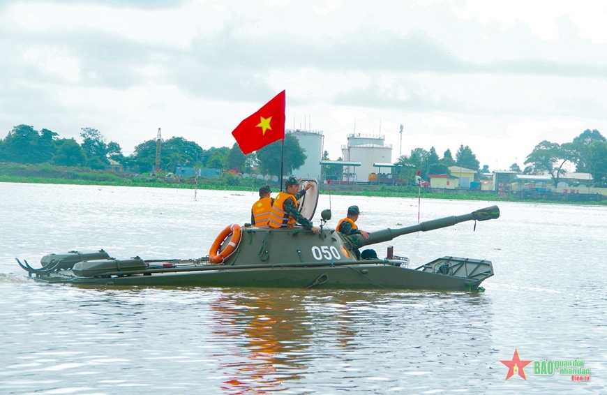 Kiểm tra lái bơi cho các lái xe ở Lữ đoàn Tăng thiết giáp 416 (Quân khu 9).