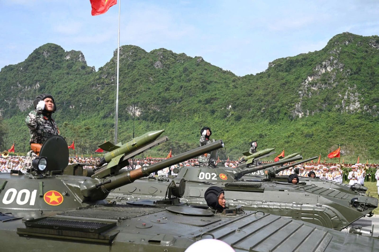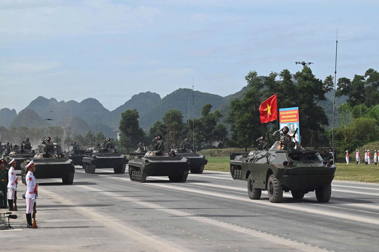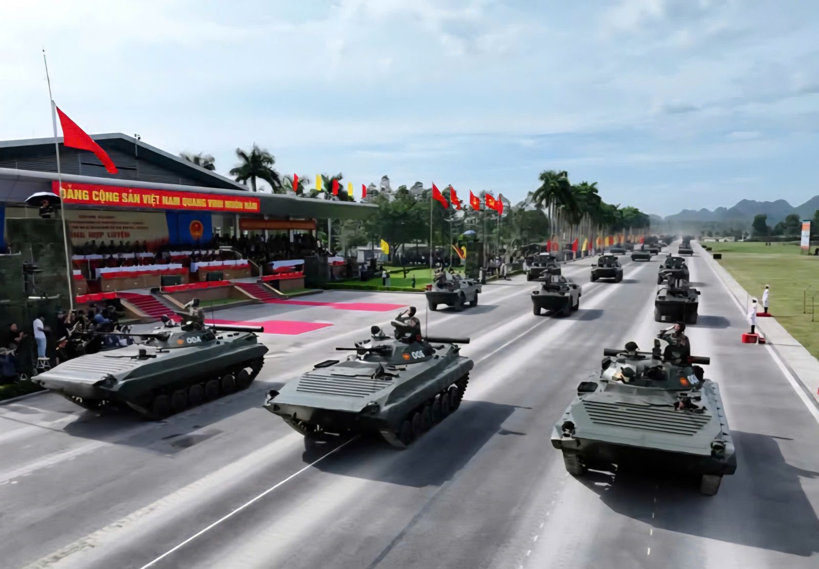 Dưới thời tiết nắng nóng khắc nghiệt của Thủ đô Hà Nội, 18 khối đứng và 43 khối đi với tư thế nghiêm trang, thực hiện động tác mạnh mẽ, chuẩn xác, thống nhất với ý chí quyết tâm hoàn thành tốt nhất nhiệm vụ.  Khối xe tăng, xe thiết giáp di chuyển trong đội hình cùng với 13 khối xe, pháo quân sự, xe đặc chủng công an, tất cả đều vận hành nhịp nhàng, thể hiện sức mạnh cơ động và khả năng sẵn sàng chiến đấu cao. Mỗi khí tài lướt qua không chỉ là sức mạnh vật chất, mà còn là biểu tượng cho ý chí bảo vệ vững chắc chủ quyền thiêng liêng của Tổ quốc.