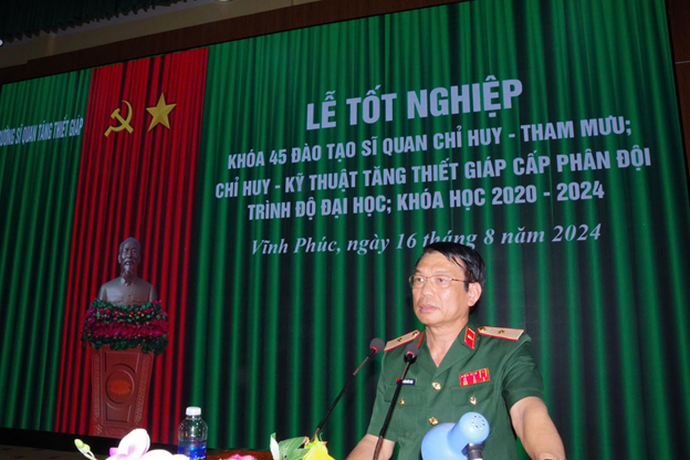 Phát biểu chỉ đạo tại buổi lễ, Đồng chí Thiếu tướng Nguyễn Đức Dinh - Bí thư Đảng ủy, Chính ủy Binh chủng đã chúc mừng 157 học viên Khóa 45ĐH, ĐK tốt nghiệp, đồng thời, yêu cầu từng đồng chí học viên tốt nghiệp ra trường về các đơn vị phải không ngừng phấn đấu, tu dưỡng về phẩm chất chính trị, đạo đức lối sống, rèn luyện nâng cao trình độ mọi mặt, có phương pháp, tác phong công tác khoa học, vận dụng linh hoạt, sáng tạo kiến thức đã được trang bị tại Nhà trường, phù hợp, hiệu quả với đặc điểm, yêu cầu, thực tiễn nhiệm vụ ở từng đơn vị,… góp phần tích cực xây dựng Quân đội nói chung và lực lượng Tăng thiết giáp nói riêng phát triển vững mạnh, vững chắc, giữ vững và phát huy truyền thống “Đã ra quân là đánh thắng” của Bộ đội Tăng thiết giáp Việt Nam anh hùng.