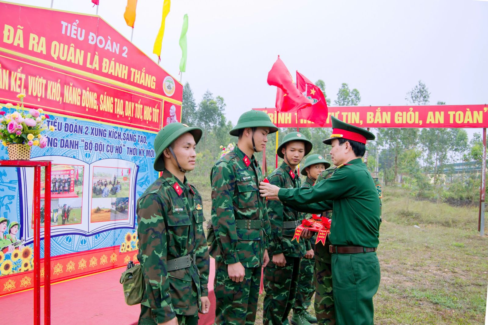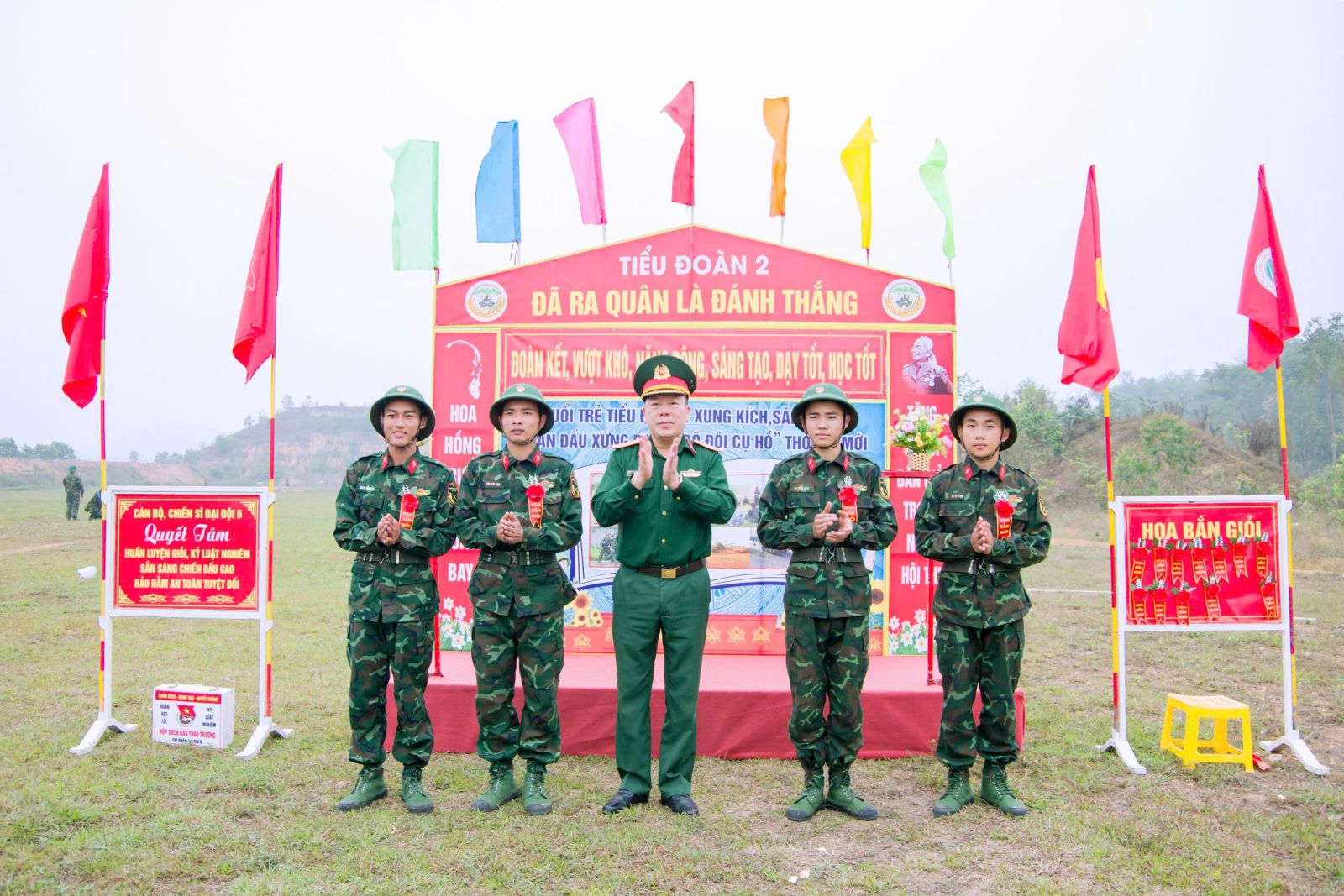 Đại tá Phan Đăng Minh, Chính ủy Nhà trường tặng hoa bắn Giỏi cho chiến sĩ mới