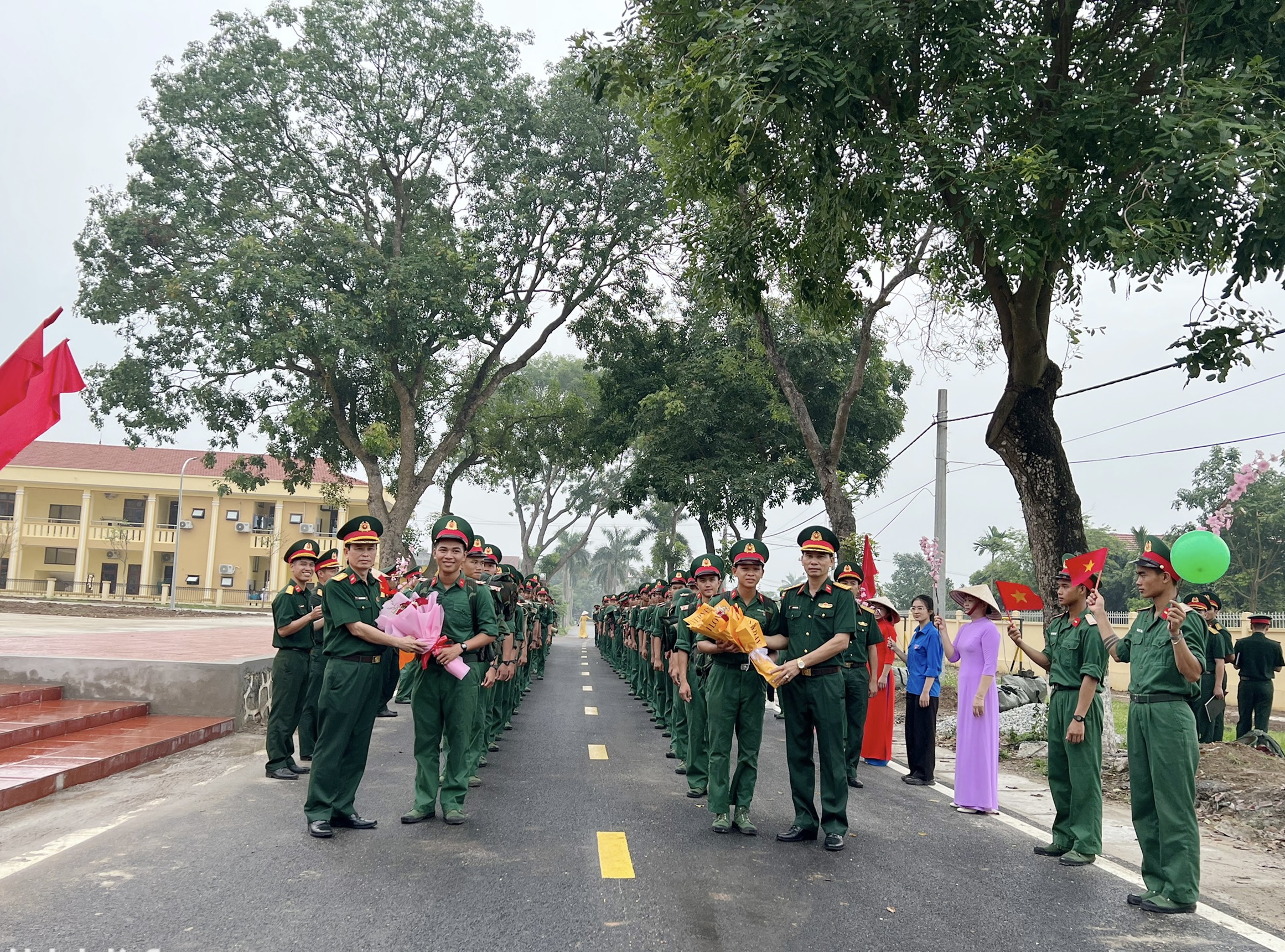 Thủ trưởng Ban giám hiệu Nhà trường, cán bộ, chiến sĩ các cơ quan đơn vị và tổ chức quần chúng trường Trung cấp Kỹ thuật TTG đón tiếp, tặng hoa các học viên đào tạo thành viên kíp xe TTG khoá 56.