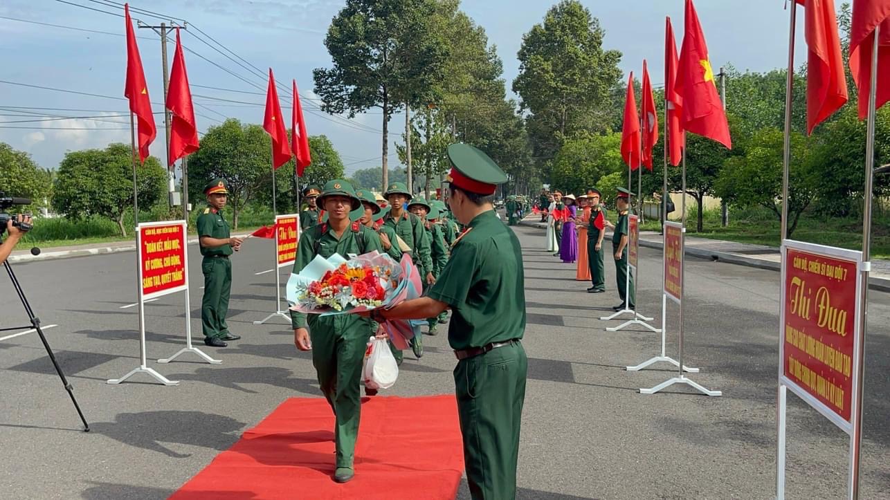 Thủ trưởng Ban giám hiệu, Phân hiệu Miền Nam Trường trung cấp Kỹ thuật TTG đón tiếp, tặng hoa chúc mừng các học viên đào tạo thành viên kíp xe TTG khóa 61.